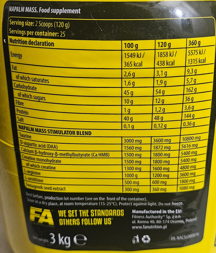 Napalm Mass by FA Nutrition is a weight gainer supplement designed to support individuals looking to increase muscle mass and overall weight. Packed with a blend of proteins, carbohydrates, and essential nutrients, it aims to provide the necessary fuel for intense workouts and muscle recovery.
